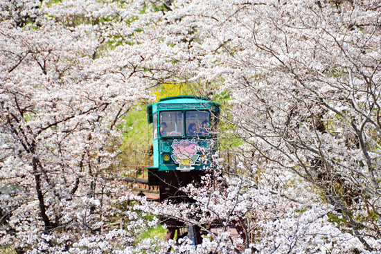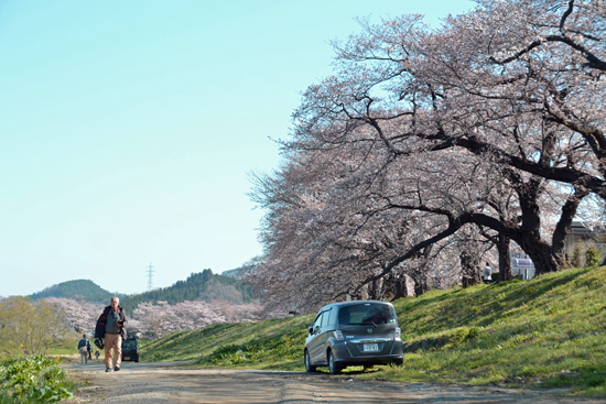 | 東北本線に沿って咲いている堤のさくら シーズン中、旅客電車はゆっくり走るため定刻より4分遅れが生じる | |||